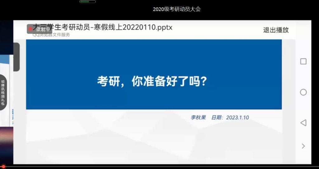 通过腾讯会议开展线上2024届考研动员大会,出席本次会议的有学院党委副书记李秋果、辅导员王陈,本次会议由辅导员王陈主持,学院2020级全体本科生参加。