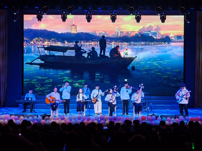 本次元旦晚会共分为《旧梦新吟·暖情岁末》《新光初绽·华彩启元》和《未来共歌·共赴新程》三个篇章,中间进行颁奖仪式。SEP街舞社以活力四射的舞蹈《whiplash》惊艳亮相,动感的旋律与青春的舞步瞬间点燃了现场气氛,拉开了晚会的序幕。艺术团带来的器乐演奏《十年人间》就像是一场跨越千年的对话,传统乐器和摇滚乐器的相遇奏响了一曲震撼人心的乐章。