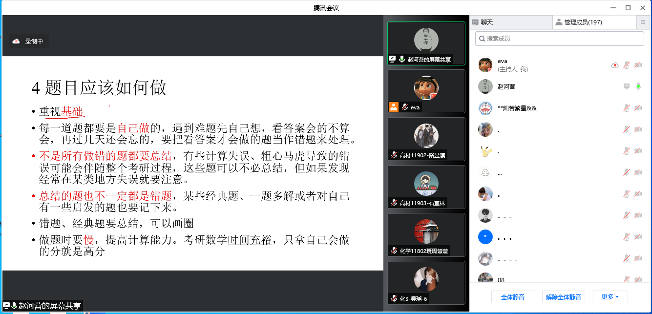 18级考研经验分享会。本次会议由辅导员王娜老师主持,石东坡教授参会,18级考研学生代表钟建铭、周慧慧、赵河营、张静、解妍分享考研经验,学院19级、20级同学线上聆听。