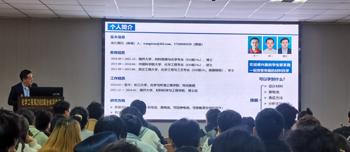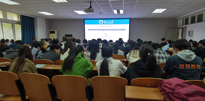 特任教授王昭老师主讲,主题为“水系锌离子电池正极材料的改性及柔性应用研究”的学术报告。此次讲座旨在提升本院研究生的科研热情,增强其对热点电池材料的了解。学院副院长赖璐、学工办主任刘敬敏、辅导员王陈出席讲座,全体研究生到场聆听。