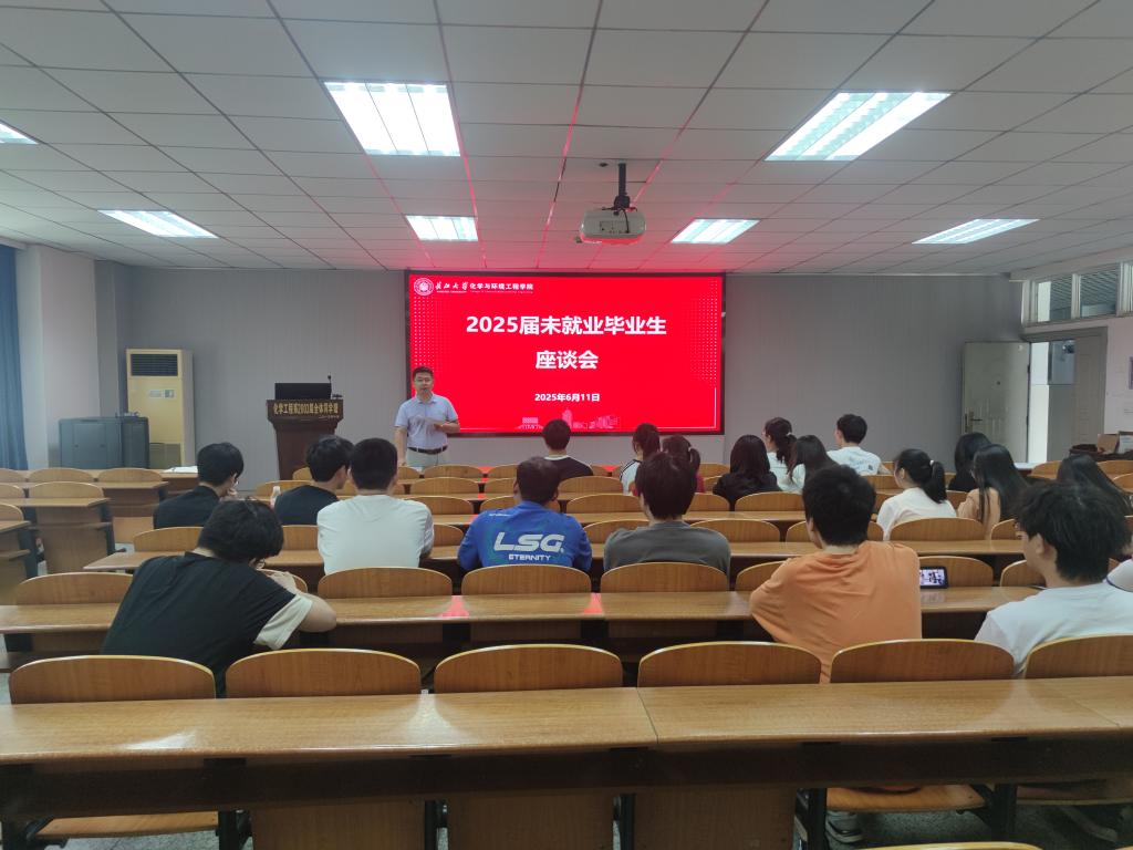 随后,党委副书记杨会军老师通报了当前学院毕业生的就业情况,深入分析了当前就业形势。他指出,尽管当前就业市场面临诸多挑战,但化工行业发展前景广阔,在新能源、新材料等领域不断涌现新的就业机会,鼓励同学们保持积极心态,主动出击,把握就业机遇。同时,他还详细介绍了学院为促进毕业生就业所采取的一系列帮扶措施,包括一对一就业指导、专场招聘会组织、校企合作岗位推荐等,让同学们感受到学院对就业工作的高度重视和全力支持。现场也向毕业生提供了数家用人单位招聘信息。