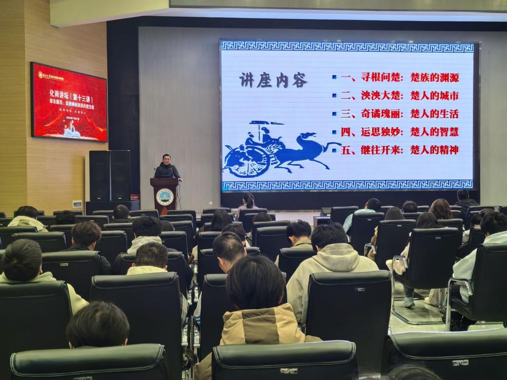 在西校区农科大楼1058报告厅举办化雨讲坛第十三讲——“走进神秘浪漫的楚文化”专题讲座。本次讲座特邀人文与新媒体学院历史系主任、荆楚文化研究中心副主任卢川老师主讲。学院党委副书记杨会军、辅导员徐茵及2025级全体学生共同参与。
