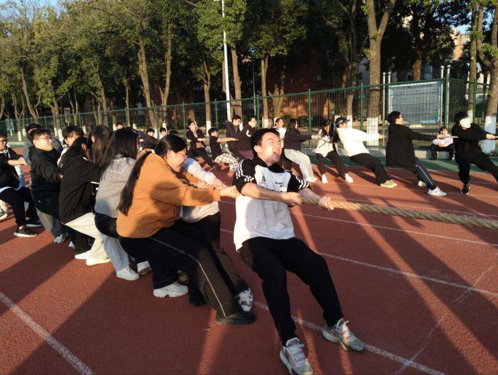 团体赛中,多人多足项目里,队员们肩并肩、脚绑脚,在默契配合中稳步前行,步伐整齐划一;盲人引导、气球大作战、同心协力等项目则各具特色,既有对团队协作的考验,也充满了欢声笑语,让大家在竞技中收获了友谊与信任。拔河项目的较量尤为激烈,各班参赛队伍紧握麻绳,脚蹬实地,在“一二、一二”的整齐呐喊中奋力后拉,绳索上的红绸来回移动,牵动着全场观众的心弦。