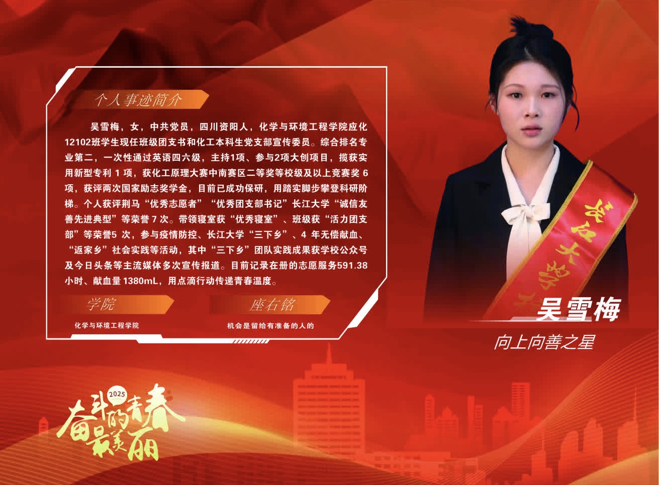 个人简介吴雪梅,女,汉族,中共党员,四川资阳人,麻豆影视 麻豆影视 应化12102班学生。现任班级团支部书记和化工本科生党支部宣传委员。