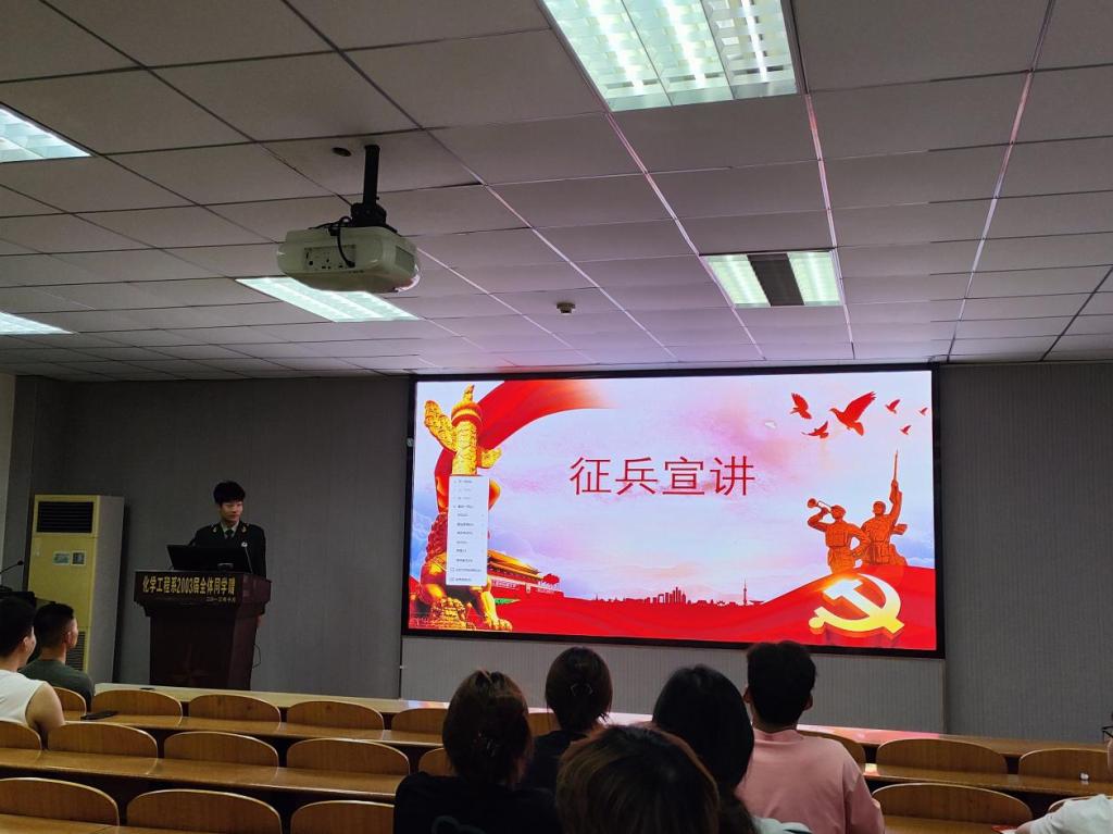 于14教北201开展2024年秋季征兵宣讲活动。活动由辅导员周学素老师主持,退役军人王昊、王博远主讲,各年级学生代表参与活动。