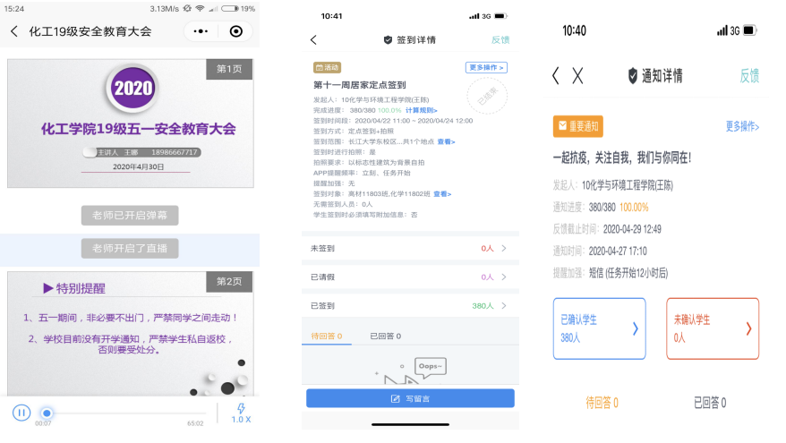 多措并举力保安全教育全覆盖。4月28日-29日,学院各年级辅导员、各班班主任通过腾讯会议、长江雨课堂、课堂派、QQ群课堂、微信群等多个网络平台,开展“五一”假期和疫情期间安全注意教育大会。会议重点围绕“节假日六防安全教育、常态化疫情防控下安全管理、居家心理健康、各年级学情分析、居家亲子关系处理”等方面展开。通过宣讲安全注意事项、列举案例、强调纪律等树牢学生安全意识。同时,通过学院官网、官Q、官微推送疫情居家学习、生活安全提示;还通过辅导猫APP签到摸排学生动向、发布五一安全心理教育资料、收集学生居家生活情况,确保安全教育全覆盖、无遗漏。