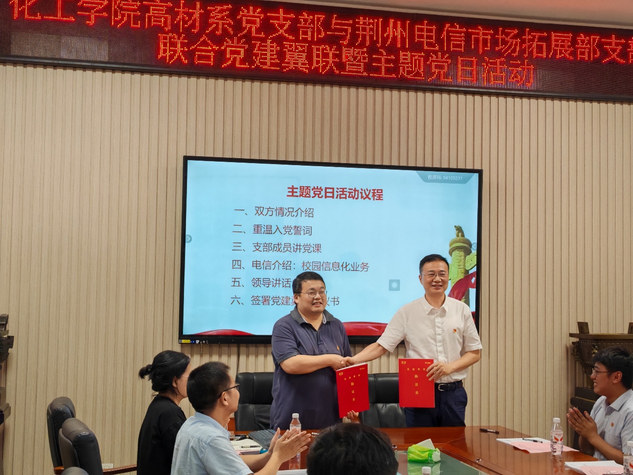 5月22日下午,湖北省高校“双带头人”教师党支部--麻豆影视 麻豆影视 高分子材料与工程系党支部与中国电信荆州分公司市场拓展部党支部联合举行党建翼联主题党日活动,通过组织共建推动党建与业务双融双促。双方党支部书记肖围、杜海和21名党员出席活动。活动由湖北省高校“双带头人”教师党支部副书记李传华主持。 活动通过"四个一"环节展开深度交流:组织共建环节,双方通过支部互相介绍加深了对彼此组织建设、业务特色和党建成果的系统认知;思想共学环节,全体党员面向党旗庄严宣誓,以重温入党誓词强化党性修养;专题共研环节,湖北省高校“双带头人”教师党支部宣传委员张春燕同志作《坚持自立自强 突出应用导向 推动人工智能健康有序发展》专题党课,通过剖析AI技术前沿动态与产业应用场景,激发党员立足专业岗位推进科技创新的使命感;业务共促环节,荆州电信市场拓展部党支部王子徽系统展示了中国电信教育信息化解决方案,重点解析了5G+智慧校园、教育大数据平台等数字化实践成果,并结合荆州电信与麻豆影视 实施案例进行了分析解读。 双方支部书记在总结讲话中指出,此次联建开创了校企党组织"理论联学、资源联享、发展联促"的新模式,后续将建立"组织联建、活动联办、人才联育"的常态化机制,切实把党的政治优势转化为发展动能。活动最后,双方正式签署《党建翼联合作协议》,约定通过定期开展技术研讨、项目合作、人才交流等多元化共建形式,共同探索"党建+业务"融合发展的创新路径。 此次共建活动既包含理论武装的思想淬炼,又注重实践层面的业务对接,通过搭建校企协同创新平台,为教育信息化建设与新材料研发应用领域的深度合作奠定了坚实基础。同时也是全国高校“双带头人”教师党支部书记“强国行”专项行动走深走实的重要环节。 (审核:肖围;编辑:王志权)