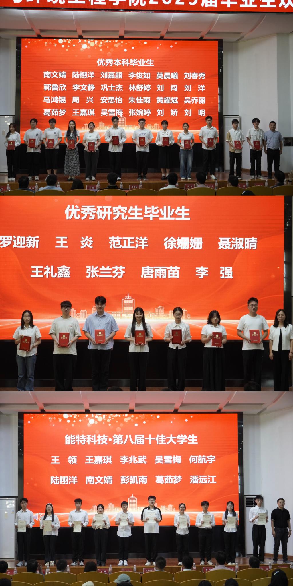 大会在热烈的氛围中拉开帷幕。主持人21级辅导员王娜以真挚的话语,向圆满完成学业的毕业生送上“毕业快乐”的美好祝福,现场掌声雷动。表彰环节中,学院对在学业、科研、实践等领域表现优异的个人与集体进行了表彰。2025届毕业生以笔为刃、以梦为马,共有136名本科生、8名研究生成功考入清华大学、南京大学等高等学府继续深造读硕读博,吴雪梅等21位同学作为考研优秀个人上台领奖;高材12102、化工12101等6个班级以及23栋A404等3个寝室,以卓越的团队协作精神脱颖而出,荣获考研先进班集体和考研优秀寝室荣誉称号;邓智豪、焦珂宣等19位学生,代表2025届57名优秀毕业生上台领奖,他们在校期间努力学习,全面发展,以青春之笔,书写了拼搏奋进的壮丽篇章;最后压轴登台的是荣获麻豆影视