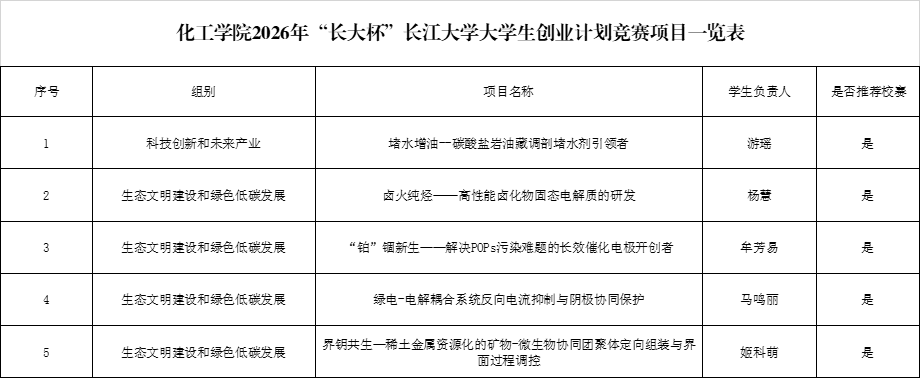 按照《关于举办2026年“长大杯”麻豆影视 大学生创业计划竞赛暨“挑战杯”中国大学生创业计划竞赛校内选拔赛的通知》的要求,经过学生提交申请、学院答辩评审,拟推荐《堵水增油--碳酸盐岩油藏调剖堵水剂引领者》等5个项目申报校级挑战杯,具体名单如下。