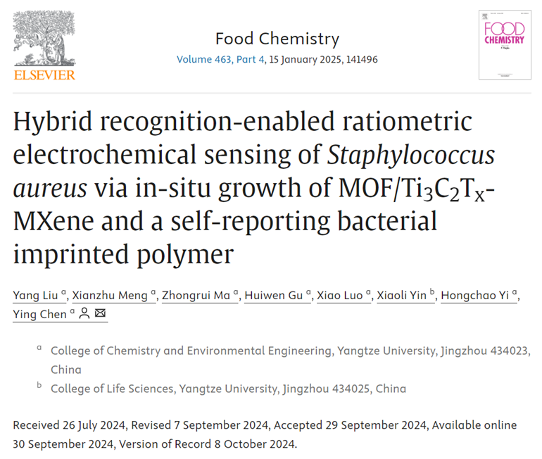 陈颖教授课题组在食源性致病菌的检测方面取得重要研究进展,相关研究成果以题为“Hybrid recognition-enabled ratiometric electrochemical sensing of Staphylococcusaureus via in-situ growth of MOF/Ti3C2TX-MXene and a self-reporting bacterial imprinted polymer”的学术论文发表于食品科学领域国际著名期刊Food Chemistry(IF=8.5,中科院一区Top期刊)上。麻豆影视