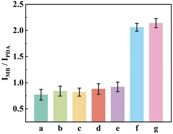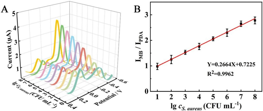 本研究提出了一种基于比率电化学传感技术的新型检测方法,用于快速检测食品中的金黄色葡萄球菌。研究团队首先合成了一种自报告分子印迹聚合物(MIP)作为内参探针(IR),并在过渡金属碳氮化物(Ti3C2Tx-MXene)上原位生长金属有机框架材料(MOF),继而修饰亚甲基蓝和万古霉素(Van),形成信号纳米探针(SP)。该方法通过混合识别机制,利用MIIP@Apt(aptamer-integrated MIP)高效捕获金黄色葡萄球菌,随后与SP结合形成三明治结构。当金黄色葡萄球菌存在时,IR的电流响应(IIR)降低,而SP的电流强度(ISP)增加,通过计算ISP与IIR的比值,实现对金黄色葡萄球菌的定量检测。实验结果显示, 该生物传感器具有广泛的检测范围(10 ~ 108 CFU mL-1)和低至1.2 CFU mL-1的检测限。此外,该方法在复杂样品中的应用也显示出良好的可行性,表明其在食品分析中的潜在应用价值。