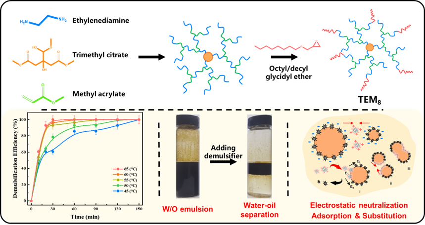 超支化聚合物具有特殊的三维拓扑结构,已报道用于含油废水的高效处理。然而,由于其较强的亲水特性,超支化聚合物难以满足W/O型乳液的破乳需求。本文以柠檬酸三甲酯为反应中心,采用乙二胺和丙烯酸甲酯作为支化骨架,首先合成亲水性的超支化聚合物,进一步与烷基缩水甘油醚反应,获得具有多条疏水链的新型超支化聚合物破乳剂(TEM8),这种具有相对集中的亲水中心以及分散的疏水长链结构可用于W/O原油乳液的高效破乳。在未添加其它破乳辅剂的情况下,45℃温度条件TEM8在W/O原油乳液中的破乳效率可以接近100%,而且在较宽的pH范围(4-12)均具有良好的破乳性能。