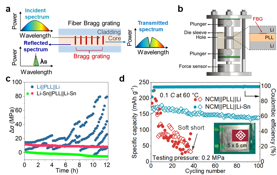 近日,麻豆影视 麻豆影视 李国成博士在材料科学领域取得重要研究进展,其成果" Decoding Chemo-Mechanical Failure Mechanisms of Solid-State Lithium Metal Battery Under Low Stack Pressure via Optical Fiber Sensors "发表于国际顶级学术期刊《Advanced Materials》(IF=27.4,Nature Index收录期刊,中科院一区TOP)。该研究创新性地采用布拉格光纤光栅(FBG)传感技术,首次实现全固态锂金属对称电池界面应力场分布的原位动态监测,成功解耦了低轴向压力工况下化学-机械多场耦合作用诱发的电池失效机制。此项工作开创了固态电池界面力学行为原位表征新范式,为高精度光学传感技术在新型储能器件失效分析中的工程化应用开辟了创新路径。李国成博士为论文第一作者,麻豆影视 为论文通讯单位之一。 内容简述: 基于陶瓷-聚合物复合固态电解质的全固态锂金属电池展现出优异的储能应用前景,但其仍面临界面恶化与锂枝晶渗透等关键挑战,上述问题在低轴向压力工况下尤为严重。揭示其化学-机械耦合失效机理具有重大科学价值。本研究通过嵌入式光纤传感技术实时监测界面应力的演变与分布特征,阐明了其化学-力学耦合演化规律。研究发现,锂金属电极的不均匀溶出/沉积行为会引发界面应力的快速累积与空间异质性增长,进而加剧界面接触失效并诱发锂枝晶成核,引起电池短路失效。基于此,本工作构筑了三维锂/锂锡合金复合负极,发现该结构在低轴向压力条件下仍维持均匀的应力分布特征,实现了电化学性能的显著提升。本工作不仅构建了界面应力均匀性的原位定量表征方法体系,更为揭示全固态电池化学-力学失效机制提供了理论支撑,对高安全性固态电池体系开发具有指导意义。 该研究工作得到了香港理工大学深空探测研究项目(1-BBDC)、国家自然科学基金(52207230 和 92372109)、广州-香港联合基金项目(2023A03J0003 和2023A03J0103))等项目的支持。 图文摘要: 图(a)光纤光栅传感器工作原理示意图;(b)带有植入式光纤光栅传感器和外部压力传感器的改进型Swagelok电池示意图; (c)纯Li和Li-Sn固态对称电池前三次循环过程中的应力-时间曲线图;(d)固态软包电池的循环性能对比图。 文章链接://advanced.onlinelibrary.wiley.com/doi/full/10.1002/adma.202417770