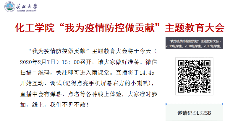 “我为疫情防控作贡献”线上主题教育大会正式开始。“我们需要知道什么?”“我们必须了解什么?”“我们可以做些什么?”主讲人杨云锋通过讲文件、举事例、列数据,深入浅出地向同学们介绍了当前的疫情防控情况,告诫同学们在抗“疫”的关键时刻,一定要注意做好自我防护,做到多通风,勤洗手,戴口罩;要遵守学校和当地防控指挥部门的规定,做到不外出,不私自返校,如实上报情况;要对党和国家有信心,做到不信谣不传谣,多为疫情防控做力所能及的工作;要尽快做好网上开学的准备,及时加入各个课程群和“雨课堂”学习平台,坚持学习。