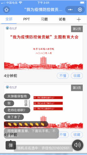 新冠疫情发生以来,学院发动辅导员、班主任和学生干部,克服种种困难,利用网络和电话远程办公,随时掌握学生所在位置和健康状况,发布学校防控信息和要求,指导学生配合线上开课,在网上开展了大量学生教育管理工作。目前,全院学生对线上授课充满期待,坚信抗“疫”战必胜!